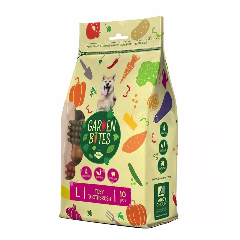 Vegetarian Garden Bites fra Duvo + er en ideell belønning eller snack for hunden din. Garden Bites inneholder ikke mindre enn 55% søtpotet. Søtpotet er et verdifullt supplement i hundens kosthold. Den er rik på vitaminer, kalsium, jern og mer. Den spesielle formen bidrar til å massere tannkjøttet og rengjøre tennene under tyggingen. Det naturlige myntekstraktet gir også frisk pust. Snackene er 100% glutenfrie, noe som gjør dem enkle å fordøye og svært egnet for hunder med allergi. Smaken gjør disse snacksen helt uimotståelig!