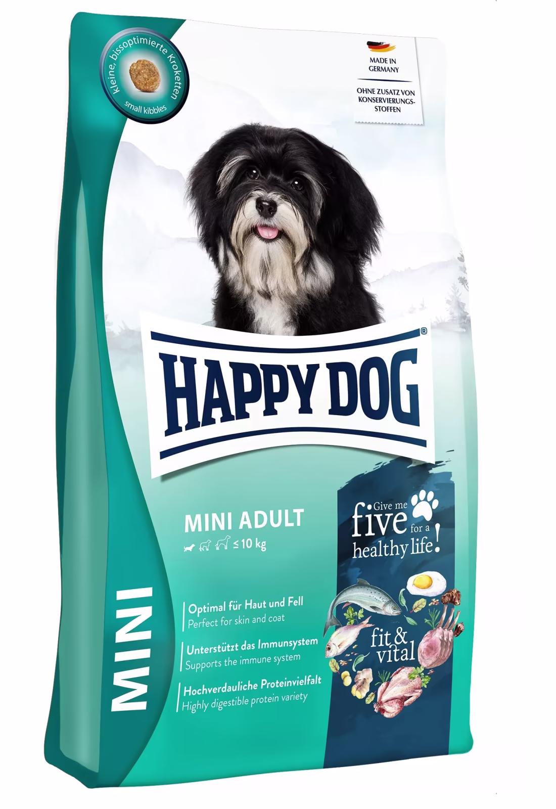 Happy Dog fit & vital Mini Adult er perfekt tilpasset behovene til små voksne hunder, og er optimal for normalt aktive hunder opp til 10 kg. Det smakfulle, balanserte fullfôret er basert på det unike Happy Dog Natural Life Concept® og er beriket med verdifulle newzealandske blåskjell for mer bevegelsesfrihet. Viktige Omega-3 og Omega-6 fettsyrer sikrer sunn hud og en skinnende pels. Den eksepsjonelt sunne, glutenfrie formuleringen støtter immunsystemet med vitamin C og spesielt utvalgte urter, slik at hunden din får et lettere liv.
