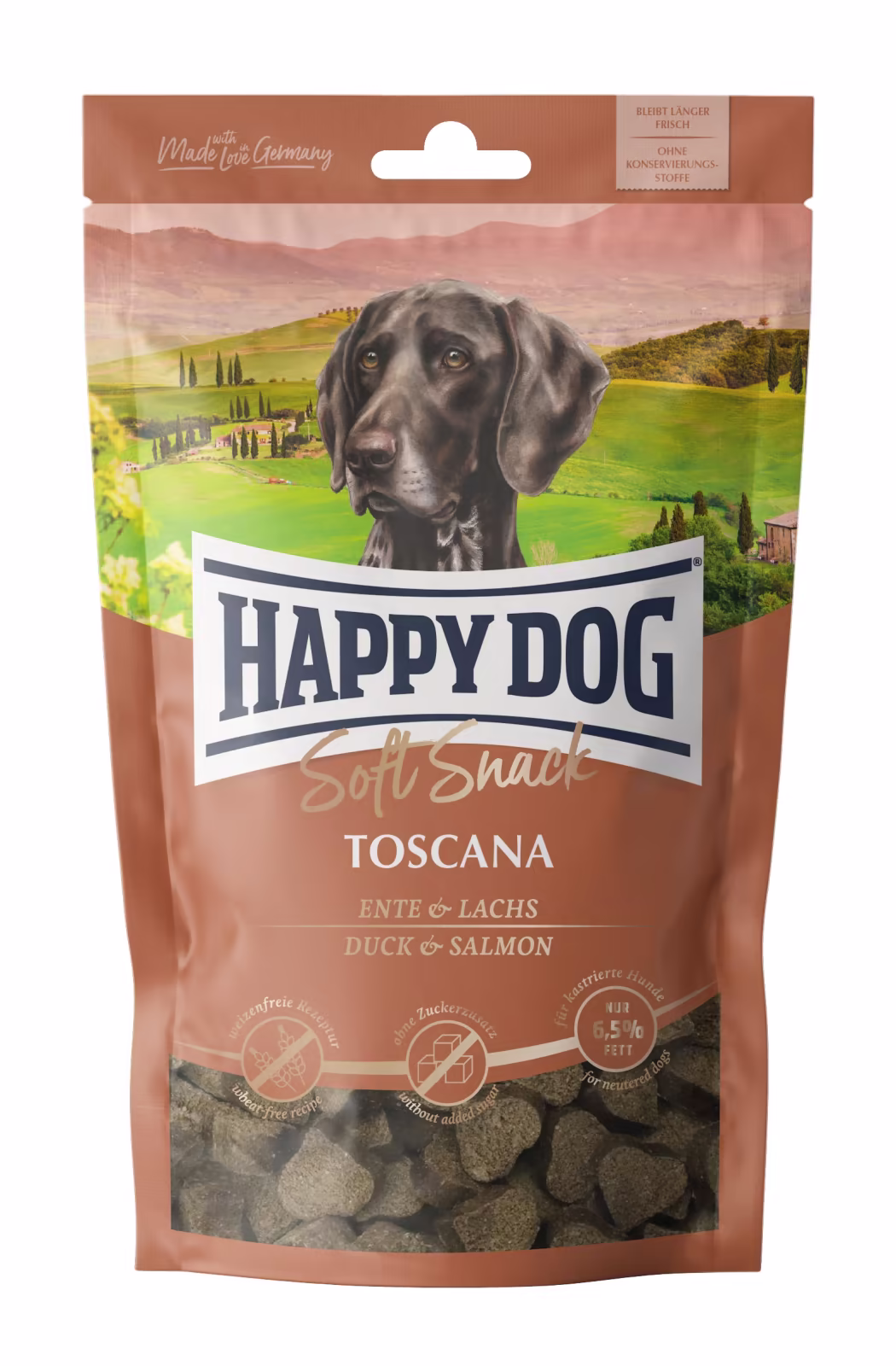 De hjerteformede myke snacksene Toscana egner seg både til velvære og som en liten godbit innimellom. Lettfordøyelig and og fin laks raffinert med aromatiske middelhavsurter er en smaksopplevelse for kresne hunder. Den hvetefrie oppskriften med moderat fettinnhold er ideell for hunder av mellomstore og store raser som er kastrerte og krevende og som har en tendens til å bli overvektige. Disse snacksene er laget uten tilsatt sukker eller konserveringsmidler. Posene er gjenlukkbare, og holder snacks ferske lenger.