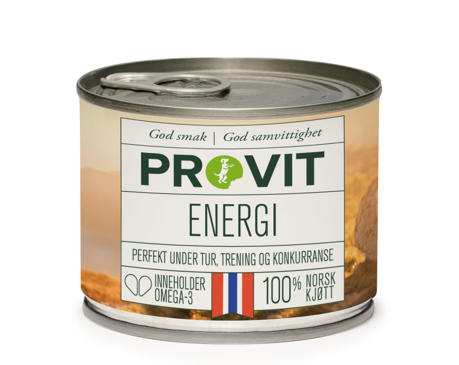 Provit Energi er et tilleggsfôr som bidrar til å øke hundens prestasjonsevne. Med denne “lunsjboksen” i sekken vil hunden din kunne prestere maksimalt ved fysiske anstrengelser. Lett fordøyelig fett og proteiner opprettholder hundens energi- og prestasjonsnivå under trening, jakt og konkurranser. Provit Energi er populær som snack og “jaktlunsj”. Den passer perfekt som et tilskudd under tur, trening og konkurranse for økt energi og utholdenhet.