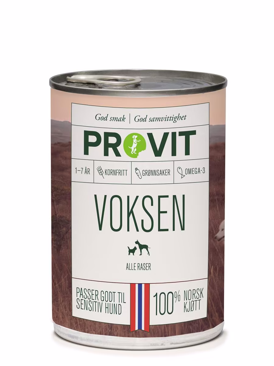 Provit Voksen er et balansert fullfôr som egner seg for alle hunder. Fôret er sammensatt av norsk kjøtt fra flere proteinkilder – et sunt og variert kosthold fra en og samme boks. Fôret er kornfritt, inneholder grønnsaker og omega- 3 fra linfrøolje. Omega-3 fra linfrøolje støtter leverens funksjon, og kan bidra til sunn pels, redusere irritasjon i hud og poter og kan i tillegg virke forebyggende mot hjerte- og karsykdommer. Provit Voksen egner seg også godt til sensitive hunder.